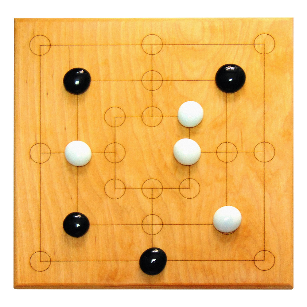Эта игра - одна из самых популярных игр в мире, по-английски называется "Танец девяти мужчин". У каждого игрока по 9 фигурок, в самом начале игроки по очереди ставят по одной фигурке на любую не занятую точку. Если в ходе этого процесса у какого-то игрока построился ряд фигурок (три в ряд), то он может убрать одну фигурку соперника.