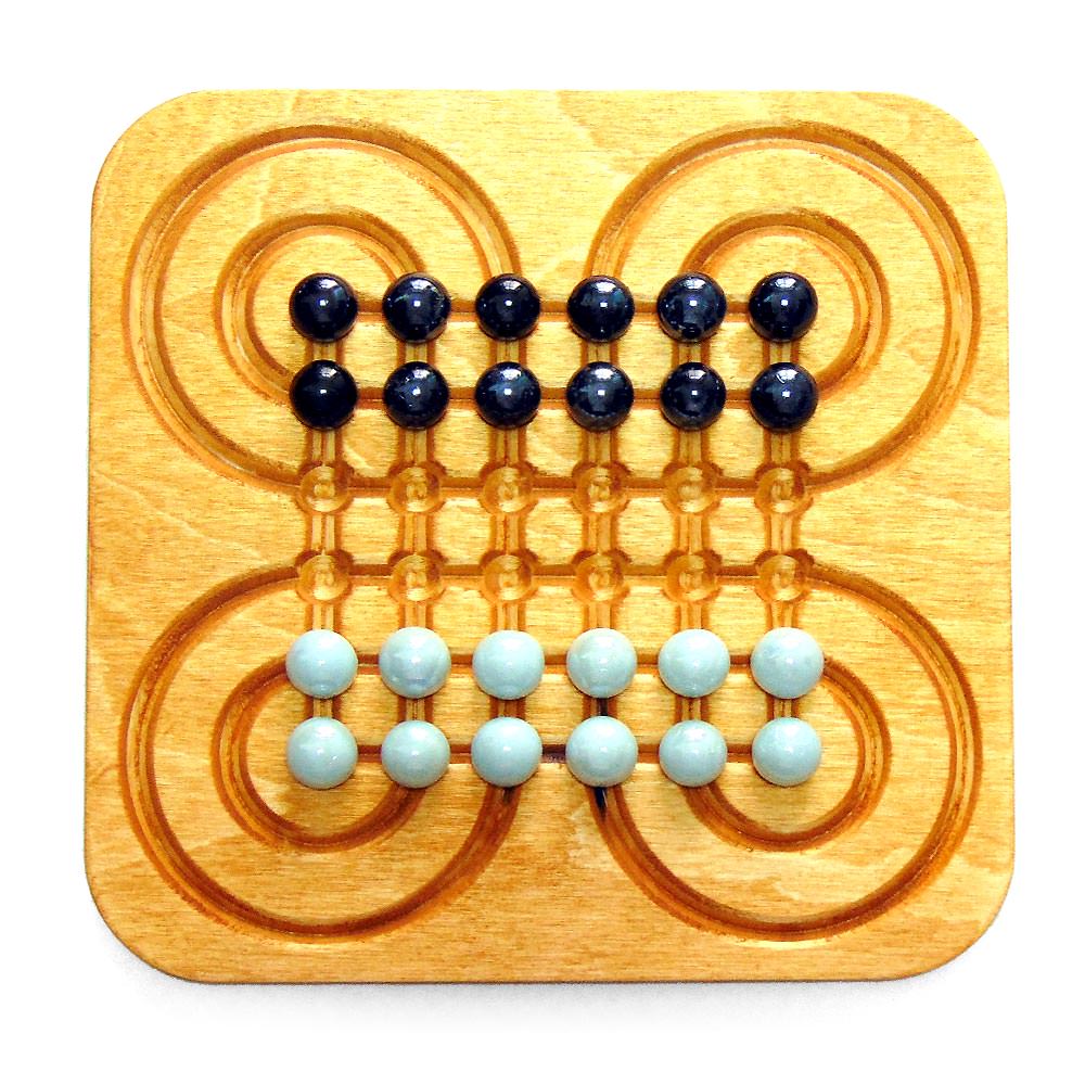 Суракарта - это один из вариантов шашек, цель, как и в обычных шашках - съесть все шашки соперника. Есть два типа ходов: обычное перемещение шашки на соседнюю незанятую точку (во все стороны), и необычный, сбивающий шашки соперника.